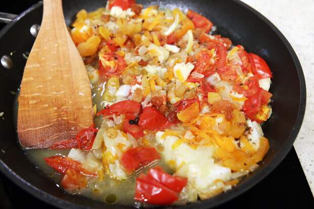 Как готовить: филе трески нарезать небольшими кусочками и обжарить. Сверху положить натертую морковь, мелко порубленный лук и нарезанные кубиками помидоры и тушить пять минут.