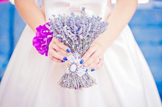 Самым лучшим вариантом будет лавандовый букет. Он выглядит просто и лаконично, так что можно немного оживить его белыми или бежевыми лентами. Кроме того, лаванду можно дополнить другими полевыми цветами белого, бежевого или светло-жёлтого цвета. Вместо лаванды можно использовать фиалки или сирень. Зелень лучше всего не добавлять, она будет лишней.