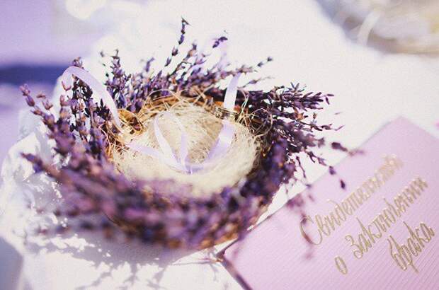 Можно использовать различные аксессуары, выполненные в лавандовом цвете. Это могут быть бутоньерки, запонки жениха, украшения невесты, подушечки для колец и так далее. Лучше всего такие детали будут смотреться на бежевом или белом фоне.