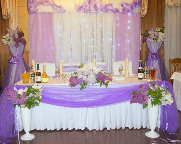 Можно выбрать белые или бежевые простые скатерти. При этом желательно использовать тарелки с каймой или узорам (например, цветами) лавандового цвета. Бокалы могут быть хрустальными. Также в этом случае можно использовать лавандовые салфетки. А бокалы невесты и жениха можно украсить лентами.