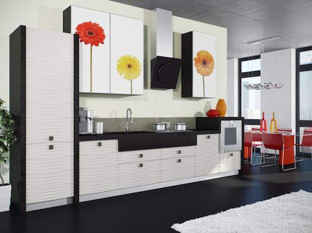 - Виниловые наклейки. Они очень популярны и позволяют создавать яркие объёмные изображения практически на любых поверхностях, в том числе и на мебели. Чтобы рисунок был ярким, выберите контрастный цвет, который будет выделяться на фоне фасада гарнитура.