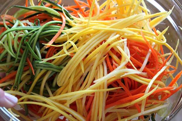 Для начала нужно очистить все овощи от кожуры и превратить их в лапшу. Времени это займет совсем немного.