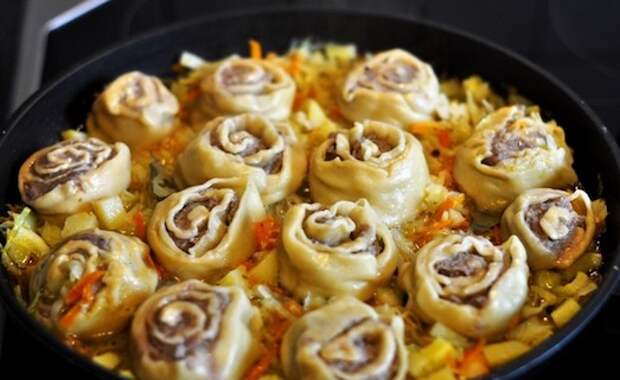 - Выкладываем неплотно штрудли на картошку разрезом вверх. Они будут увеличиваться в размере, поэтому оставляем небольшие промежутки.
